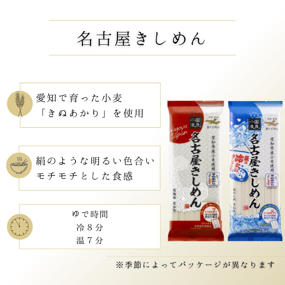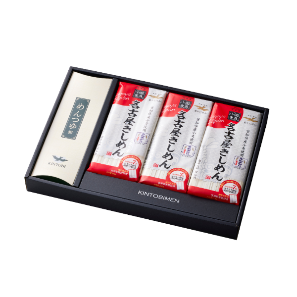 適度なコシと弾力、つゆ乗りの良い幅広のめん線と滑らかな舌触りに、明るく艶感のある麺肌が特長の「名古屋きしめん」にめんつゆがセットになって、大切な方への贈り物に最適です。もちろんご自宅用にも是非どうぞ。